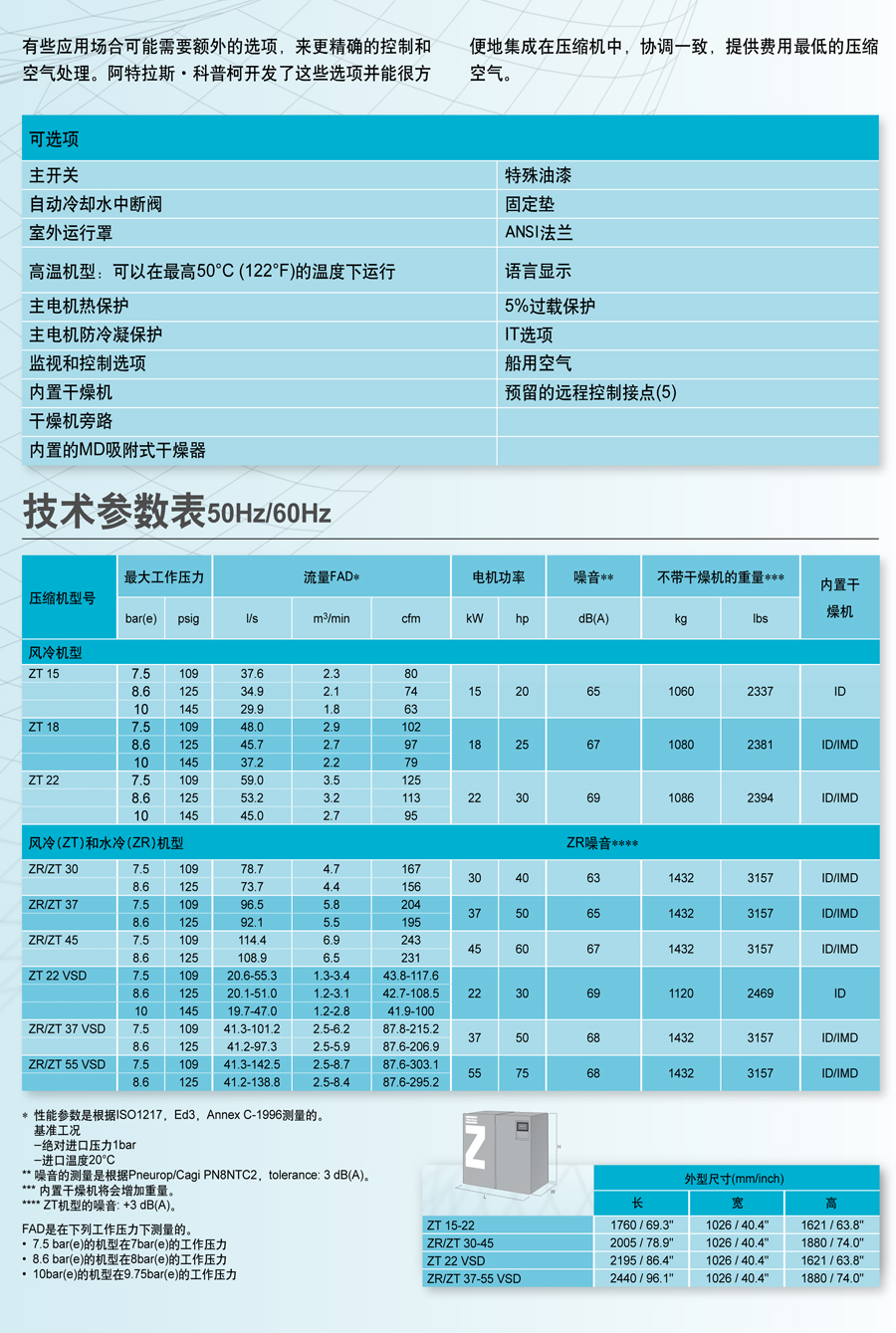 - 运行安静 – 冷却器的立式设计可降低风扇、电动机、元件的噪声级别。此外,ZR/ZT 压缩机装在隔音机壳中,因此无需占用单独的压缩机房并可以安装在大多数的工作环境中。
