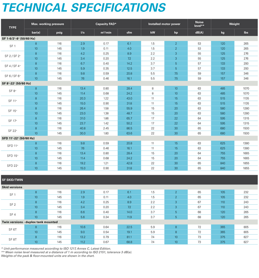 - 节能 - SF 涡旋式压缩机标准配置 IE3 超高效电机,非常适用于对灵活性和能效有苛刻要求的敏感应用场合。简单的启动/停止控制消除了卸载功率的损耗。涡旋技术的排气量并符合较低运转周期的应用