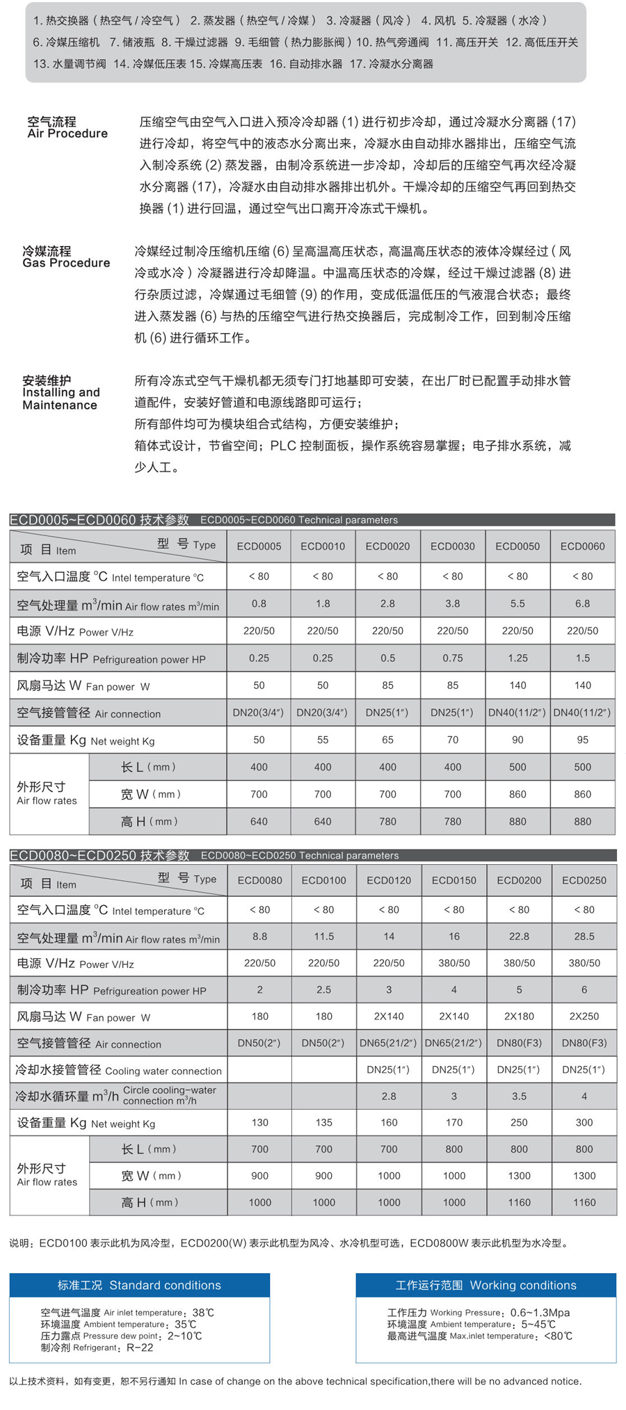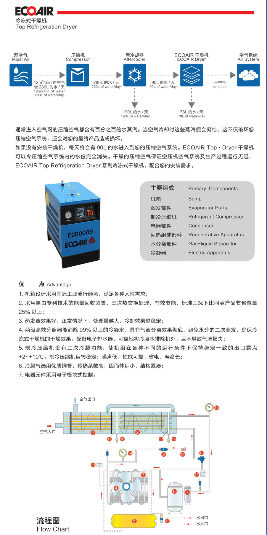 简要介绍:采用自由专利技术的能量回收装置,三次热交换处理,有效节能,标准工况下比同类产品节省能量25%以上; 2.蒸发器效果好,正常情况下,处理量越大,冷却效果越稳定; 3.两级高效分离器能消除99%以上的冷凝水,具有气液分离效果彻底,避免水分的二次蒸发,确保冷冻式干燥机的干燥效果。配备电子排水器,可靠地将冷凝水排除机外,且不导致气流损失; 4.制冷压缩机设有二次冷凝功能,使机组在各种不同的运行条件下保持稳定一致的出口露点+2~+10℃。制冷压缩机运转稳定;噪声低、性能可靠、省电、寿命长;