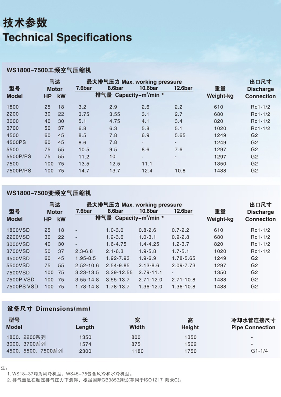 简要介绍:WS系列双螺杆空气压缩机是寿力公司在对全球市场需求和竞争对手进行了充分调查研究的基础上,汇集了中、美、法、澳各国优秀工程师的智慧,历时两年多,设计开发出的寿力精品系列空气压缩机。该产品具有外形美观、结构紧凑、高效节能、噪音低等特点,整机采用箱式结构,优化了进排风道设计,使用美国原装压缩主机和高效NEMA电机,采用电子式自动排水系统等优质零部件,同时更加注重人性化设计和降低噪音,提供了宽敞的应用和维护空间,方便了广大用户的使用和管理,受到客户的欢迎和好评。